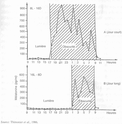 Sur ce graphique on voit que la mélatonine est sécrétée en grande quantité la nuit. On voit que la mélatonine est produite moins longtemps lors des jours longs(de 1 heure à 9 heures) que lors des jours courts(de 18 heures à 9 heures).